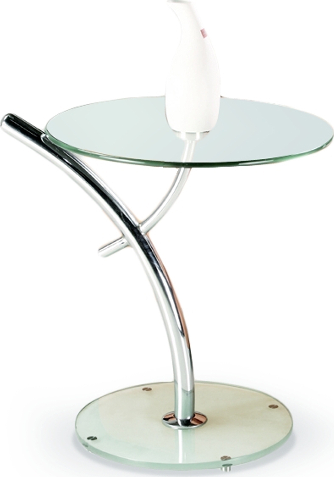 Et tøft sidebord med et moderne design. Stammen er laget i forkrommet metall og foten samt bordplaten er av glass.