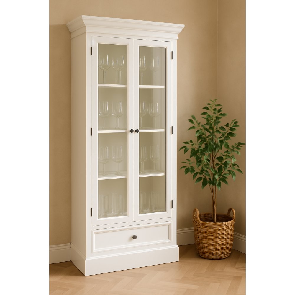 Vitrineskap i antikkhvitt med 2 dører i herdet glass, 3 hyller samt en skuff nederst.