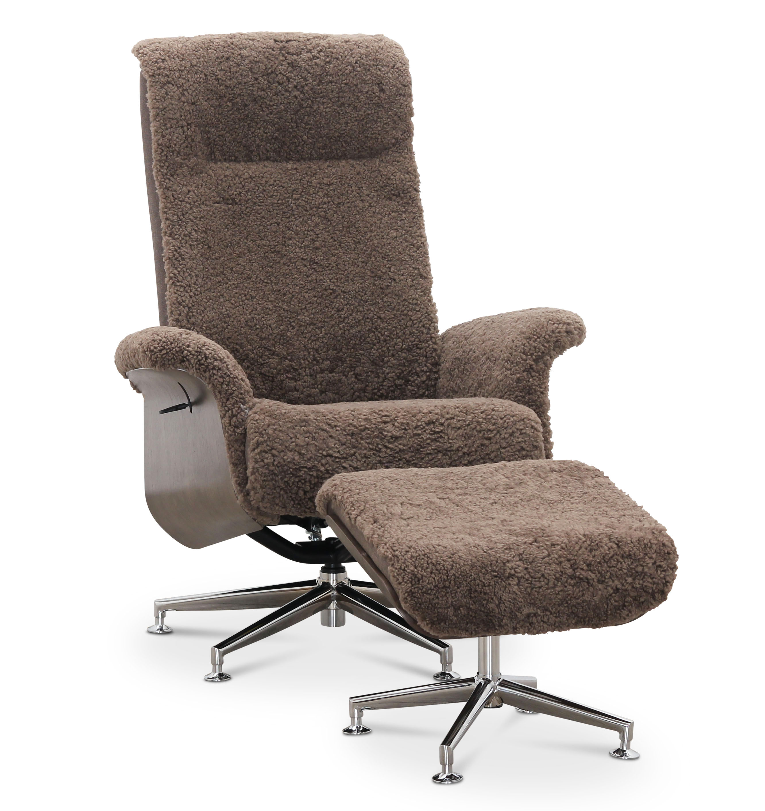Lenestol med recliner trukket i ekte brunt saueskinn og har vakkert oljet eik på armlenene, noe som gjør den til en lenestol med et klassisk preg. Stativet i forkrommet metall gir en moderne kontrast og fremhever det klassiske designet.