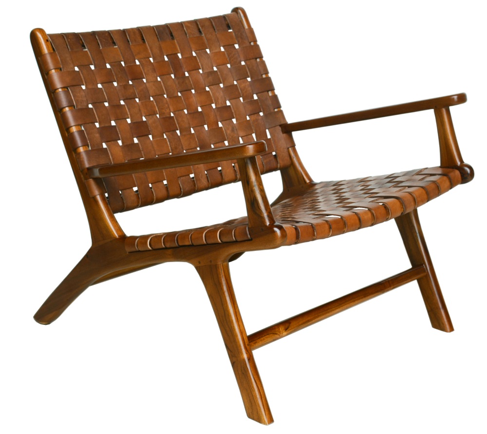 Porto lenestol i massivt teak med sete og rygg i vevet av brunt lær. Lenestolen tilhører vår populære serie Porto.