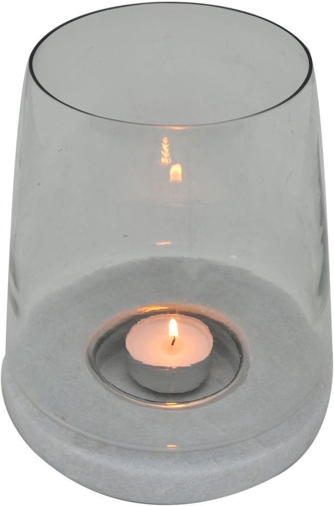 Lanterne i klarglass og hvit marmor.