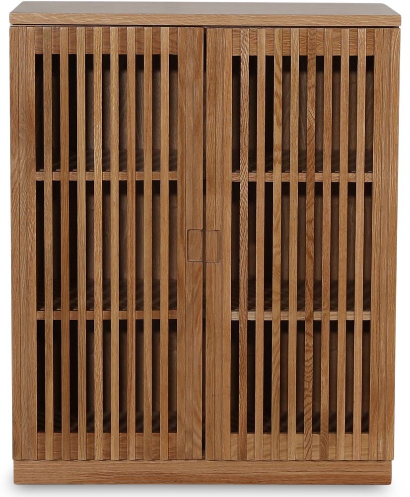 Level er en serie skap og sideboards som er beiset i svart, eik eller whitewash med dører i forskjellige utførelser. Laget av MDF og eikefinér, stamme av solid eik. Dørene er beiset i samme farge som skapet. Velg utførelsen som passer ditt hjem. To justerbare hyller følger med i hvert skap.