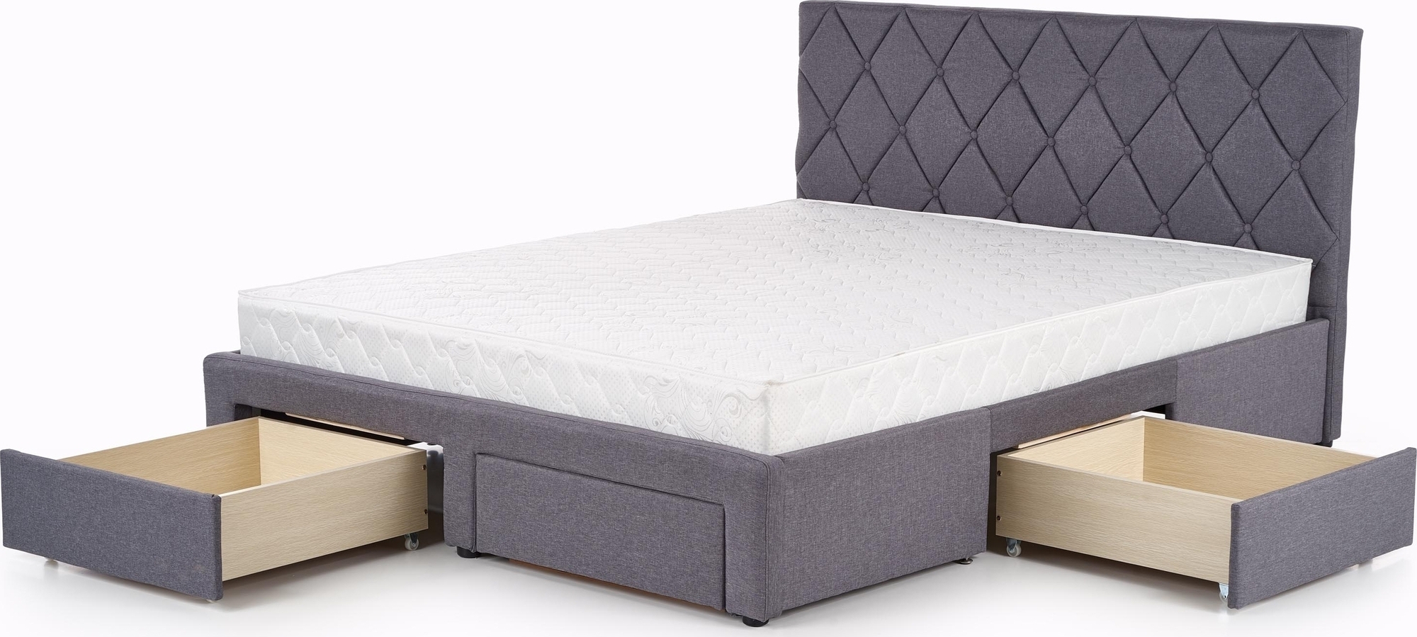 En fin seng med stilrent design. Sengen er produsert av solid tre og kledd med komfortabelt stoff med praktiske skuffer i rammen for smart lagring av for eksempel klær. Bena har fått en svart farge.