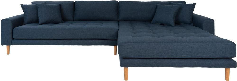 Høyrevendt sofa i mørkeblått. 4 puter er inkludert.
