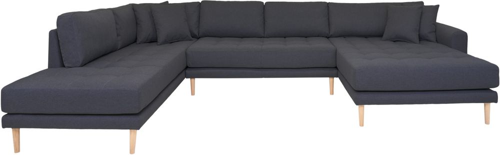 Høyrevendt sofa i mørkegrå. 4 puter er inkludert.