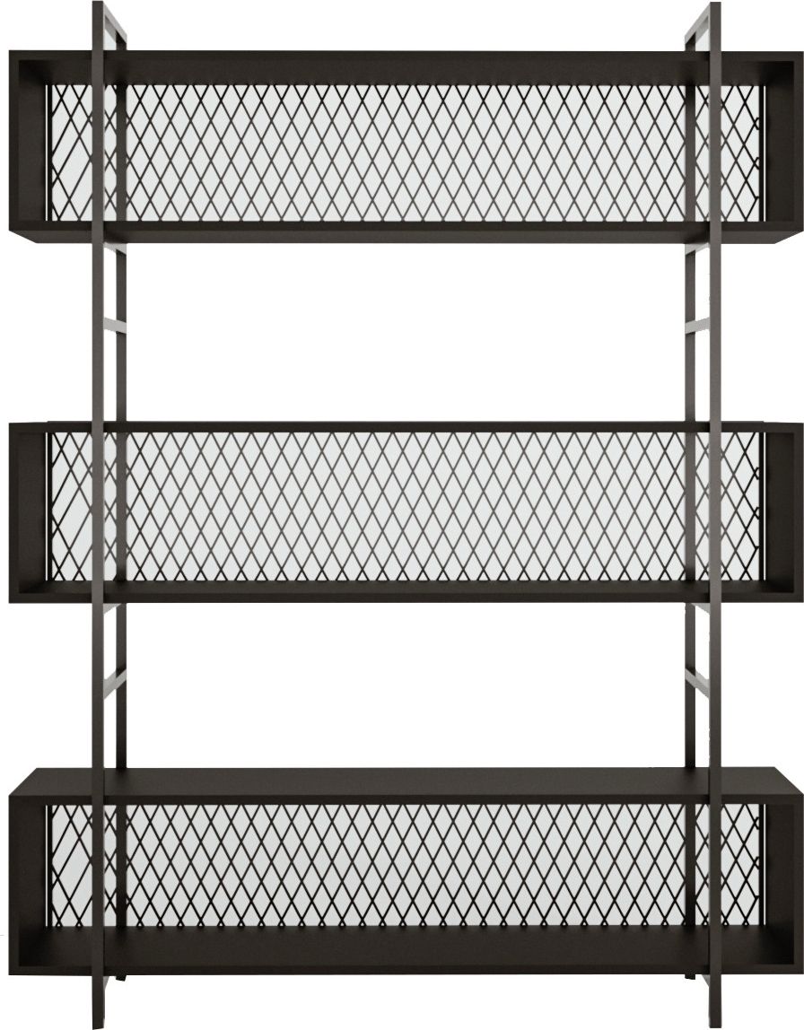 Bokhylle laget av melaminbelagt sponplate. Metallben.