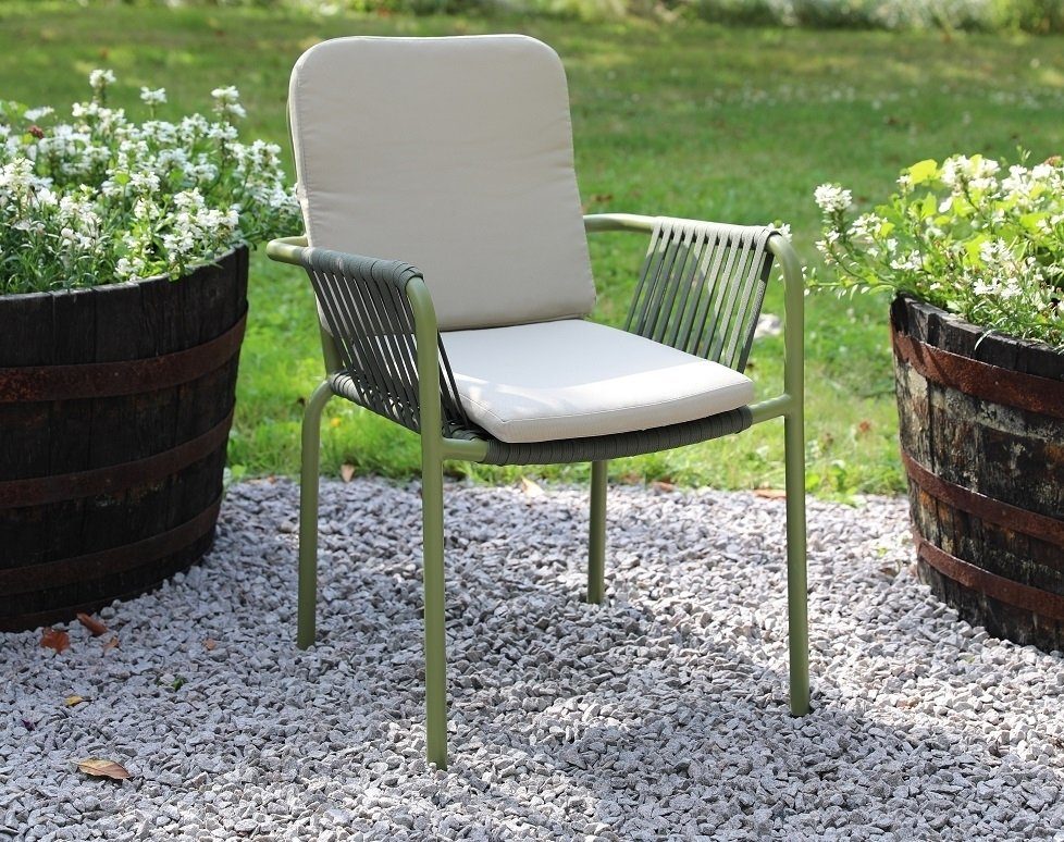 Stol i slitesterk og værbestandig aluminium, grønn ramme med repsits. Beige pute for god komfort.