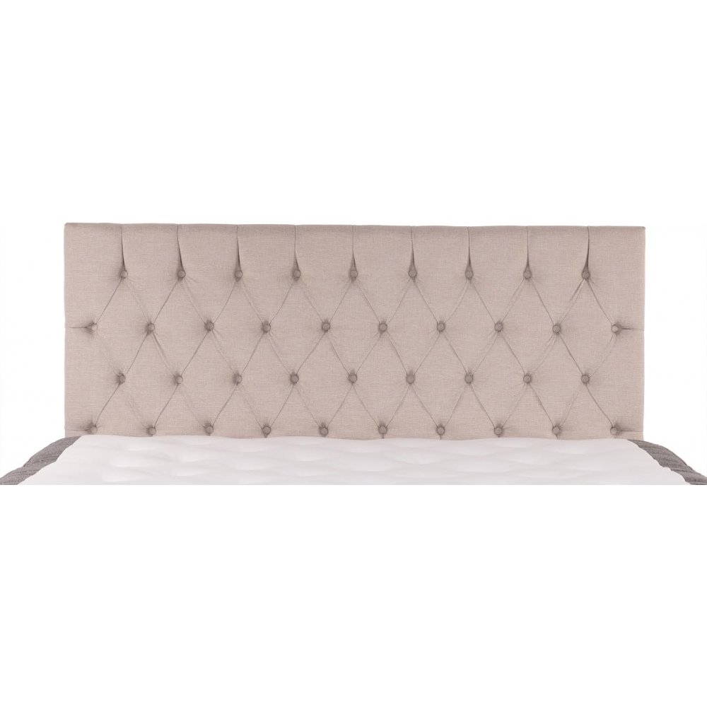 Linne vegghengt sengegavl er en håndlaget gavl med lyst stoff utført i lin. Gavlen begges med nedsenkede knapper og et utførelse som gir luksus og stemning til soverommet.