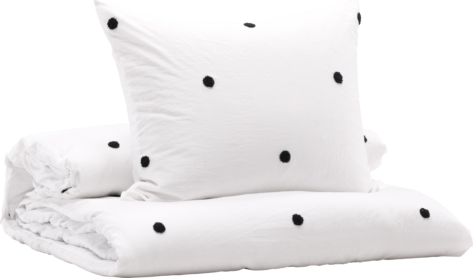 Sengen som er like kosete å ligge i som den er fin å sove på. Sengetøyet er laget av det slitesterke og behagelige materialet mikrofiber, som er vaskbart og tåler tiden. Sengesettet er hvitt med svarte tuftede prikker som skaper et livlig blikkfang i trendy farger.