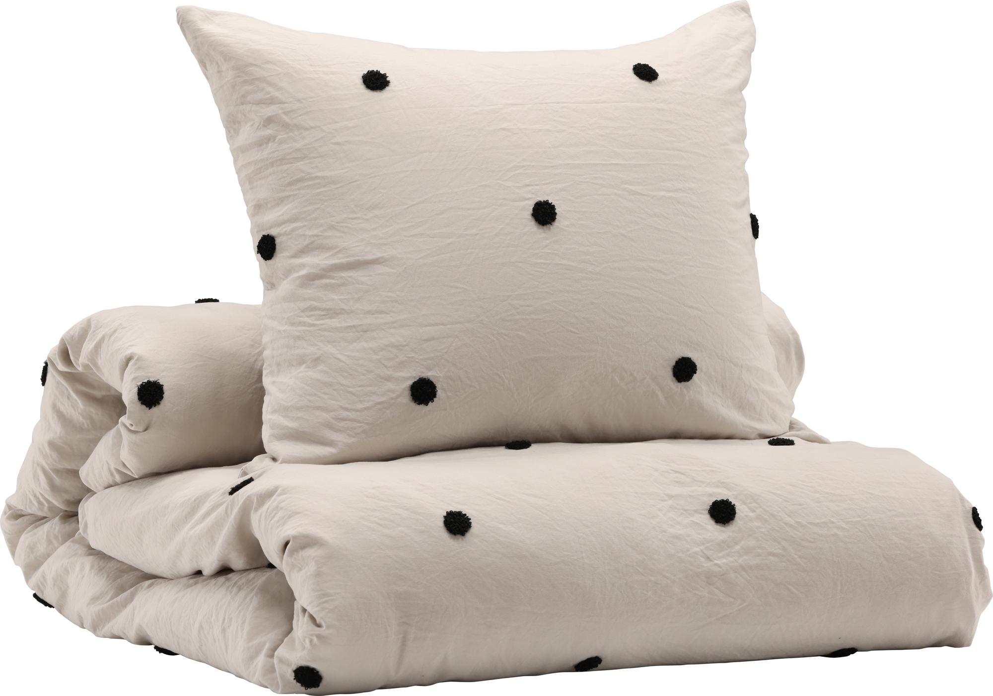 Sengen som er like kosete å ligge i som den er fin å sove på. Sengetøyet er laget av det slitesterke og behagelige materialet mikrofiber, som er vaskbart og tåler tiden. Sengesettet er lysegråt med svarte tuftede prikker som skaper et livlig blikkfang i trendy farger.