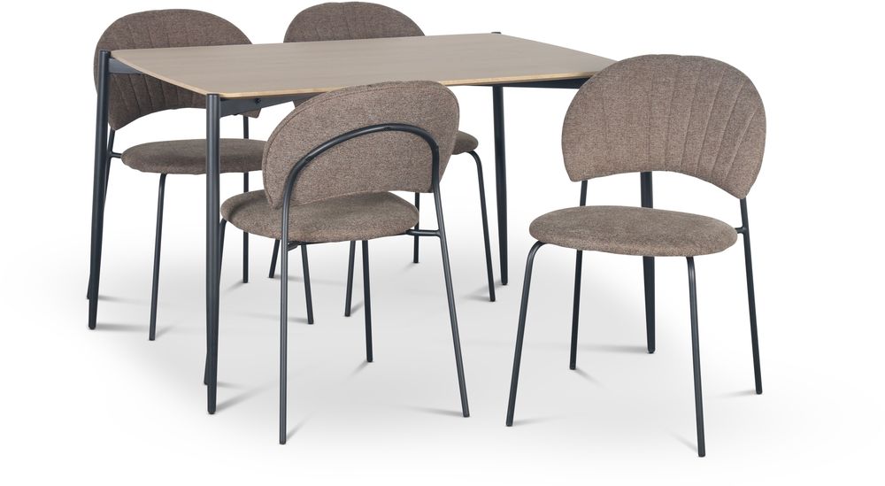 Lokrume spisegruppe bestående av et bord på 120 cm med topplate av MDF i lys treutførelse, understell av svart pulverlakkert metall. Inkludert 4 stk. Hogrän stoler med brunt trekk og svart ramme. En spisegruppe i stilig moderne design. Fokus på et minimalistisk design og fargevalg som passer godt sammen.