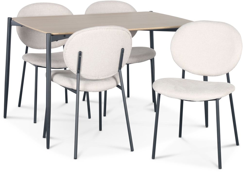 Lokrume spisegruppe bestående av et bord på 120 cm med topplate av MDF i lys treutførelse, understell av svart pulverlakkert metall. Inkludert 4 stk. Tofta stoler med beige trekk og svart ramme. En spisegruppe i stilig moderne design. Fokus på et minimalistisk design og fargevalg som passer godt sammen.