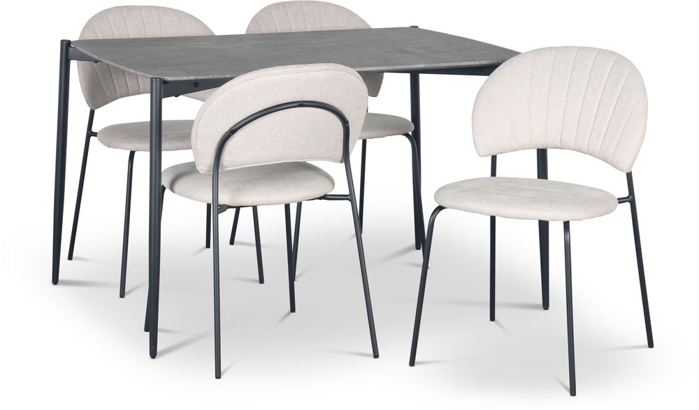 Lokrume spisegruppe bestående av et bord på 120 cm med topplate av MDF i betongimitasjonutførelse, understell av svart pulverlakkert metall. Inkludert 4 stk. Hogrän stoler med beige trekk og svart ramme. En spisegruppe i stilig moderne design. Fokus på et minimalistisk design og fargevalg som passer godt sammen.