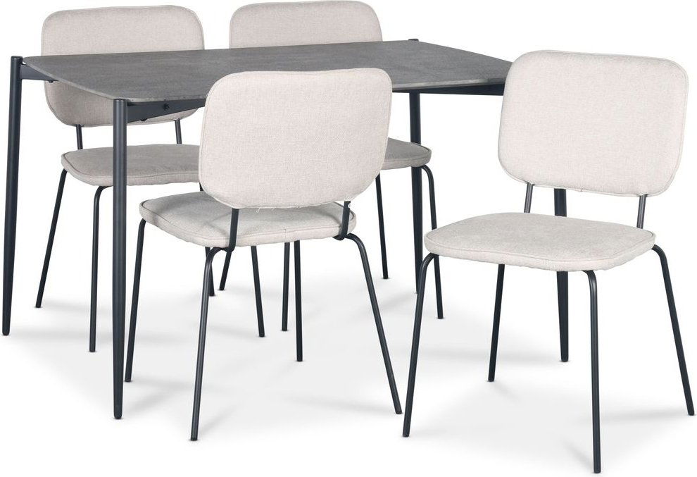Lokrume spisegruppe bestående av et bord på 120 cm med topplate av MDF i betongimitasjonutførelse, understell av svart pulverlakkert metall. Inkludert 4 stk. Lokrume stoler med beige trekk og svart ramme. En spisegruppe i stilig moderne design. Fokus på et minimalistisk design og fargevalg som passer godt sammen.