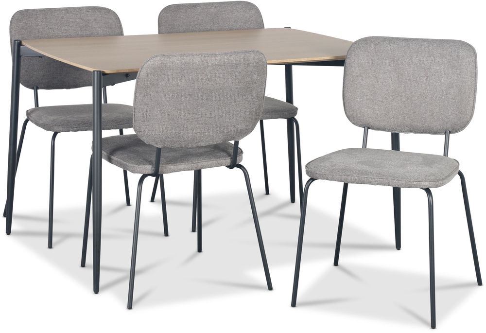 Lokrume spisegruppe bestående av et bord på 120 cm med topplate av MDF i lys treutførelse, understell av svart pulverlakkert metall. Inkludert 4 stk. Lokrume stoler med grått trekk og svart ramme. En spisegruppe i stilig moderne design. Fokus på et minimalistisk design og fargevalg som passer godt sammen.