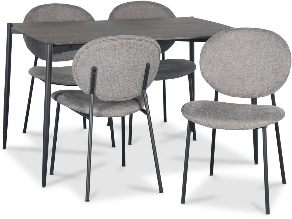 Lokrume spisegruppe bestående av et bord på 120 cm med topplate av MDF i lys treutførelse, understell av svart pulverlakkert metall. Inkludert 4 stk. Tofta stoler med grått trekk og svart ramme. En spisegruppe i stilig moderne design. Fokus på et minimalistisk design og fargevalg som passer godt sammen.