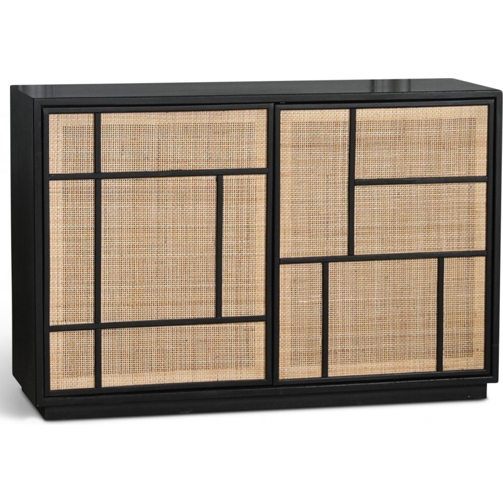 Stockholm skjenk i svartlakkert treverk med rottingfronter. Skjenken har to hyller. Denne skjenken har gode oppbevaringsmuligheter og et trendy design.
