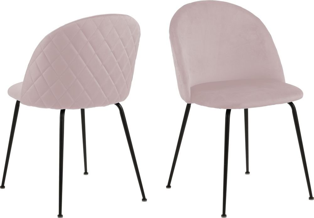 Spisestol kledd med et behagelig lyserøtt stoff for maksimal komfort. Rammen er laget av svart pulverlakkert metall.
