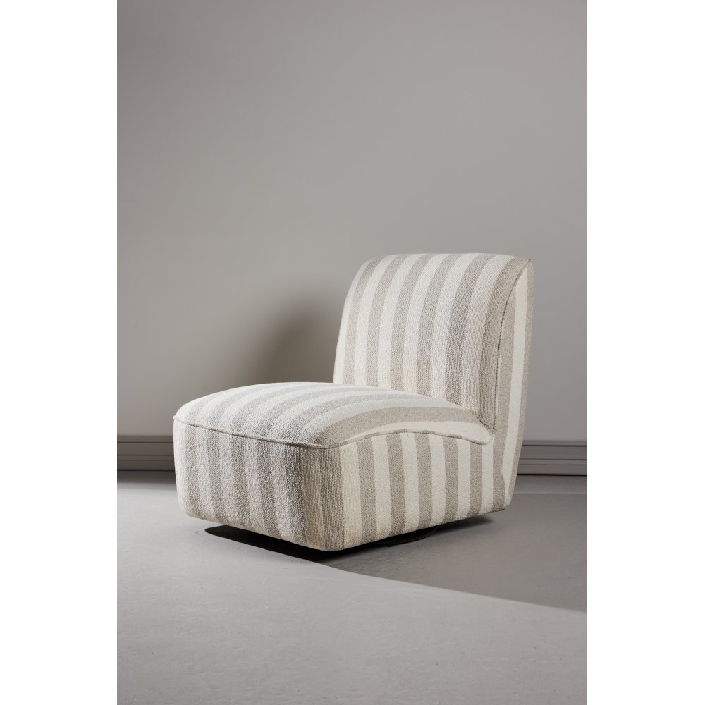 My er en innbydende lenestol uten armlener, designet for å tilby både komfort og karakter. Det sjenerøst polstrede setet og ryggen gir en komfortabel sitteopplevelse - perfekt for avslapning, lesing eller lange samtaler. Stolen skiller seg ut med sitt tekstiltrekk i brede, hvite og beige striper som gir den et lekent, men elegant uttrykk. Takket være sin minimalistiske form passer My like godt inn i stuen som på soverommet eller i gangen - en fleksibel og stilig lenestol for det moderne hjemmet.