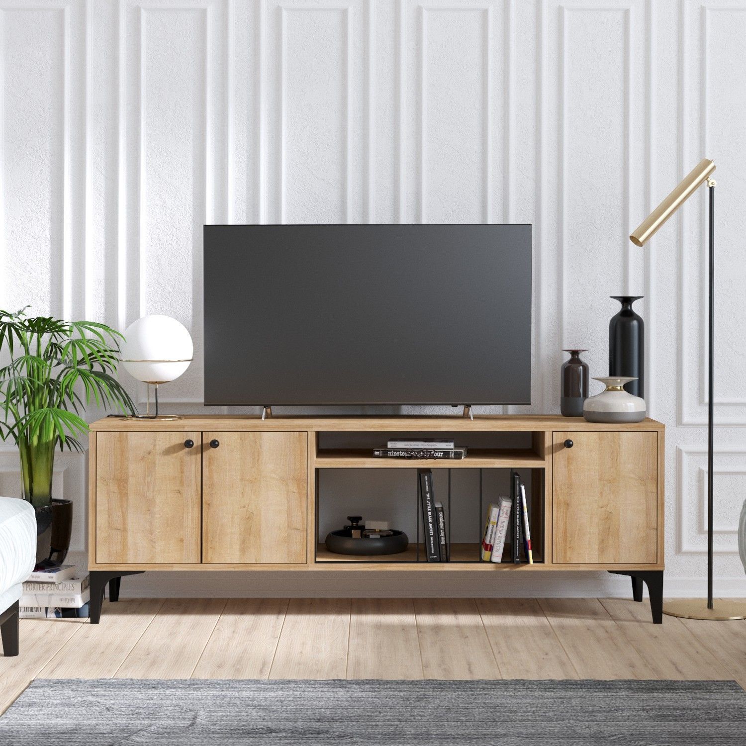 Mediebenk laget av tre og plast.