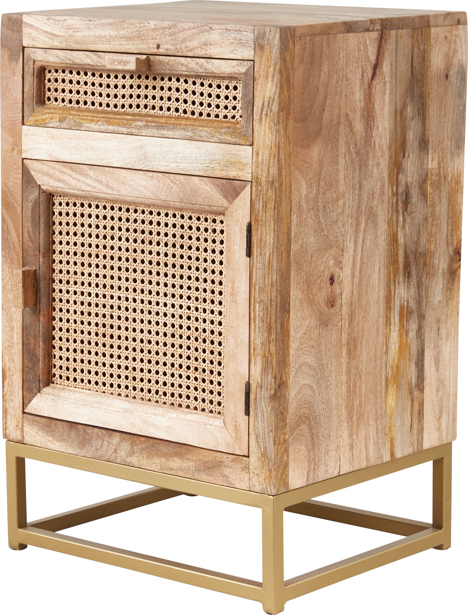 Luna nattbord med 1 skap og 1 oppbevaringsskuff. Laget i mangotre med naturlig trefinish. Fronten på skuff og skap er laget av rotting.