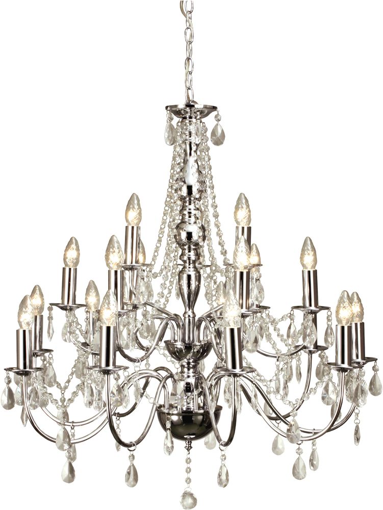 Lysekrone i forkrommet metall og krystaller i glass. Henges enkelt opp i taket.