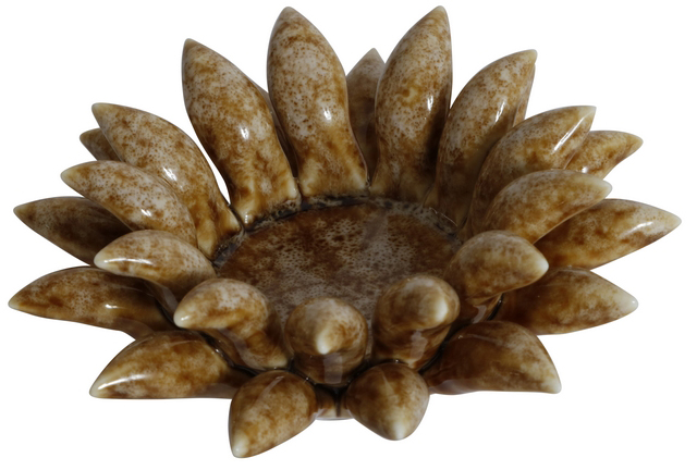 En fin lysholder formet som en dahlia blomst i lysbrun keramikk.