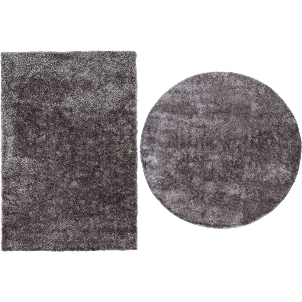 Polyesterteppe i grå fargetone. Materialet skinner vakkert i den høye luggen, og skifter glans avhengig av hvordan lyset treffer.