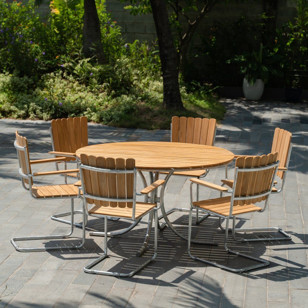 Möllan utegruppe i teak: 6 lenestoler med spisebord Ø130 cm