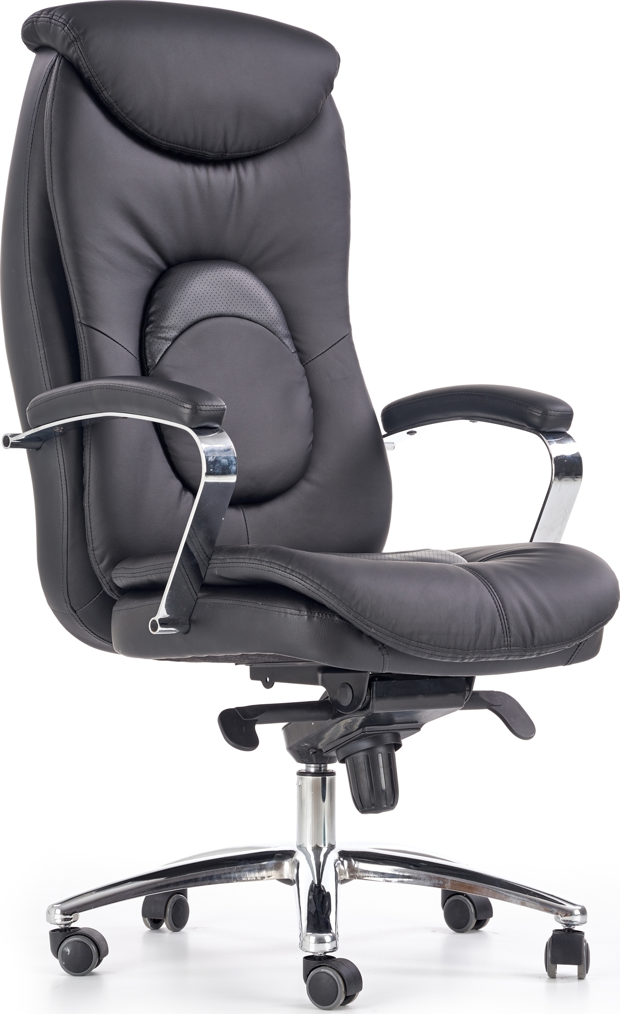En vakker kontorstol med et moderne design. Kontorstolen er kledd med et svært behagelig kunstskinn som gir maksimal komfort. Stolhøyden er lett justerbar ved hjelp av spaken under setet, og stolen er lett å flytte takket være hjulene på stjernefoten.