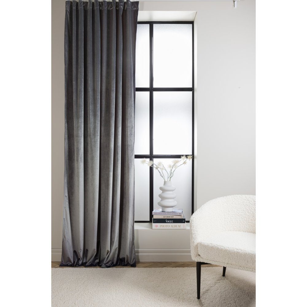 Gardinlengde i polyesterfløyel med en blank overflate som skinner fint i lyset. Gardinlengdene har påsydde multifunksjonsbånd som gjør at de kan henges opp på forskjellige måter, enten med fingerkroker, skjult oppheng eller i gardinkanalen.