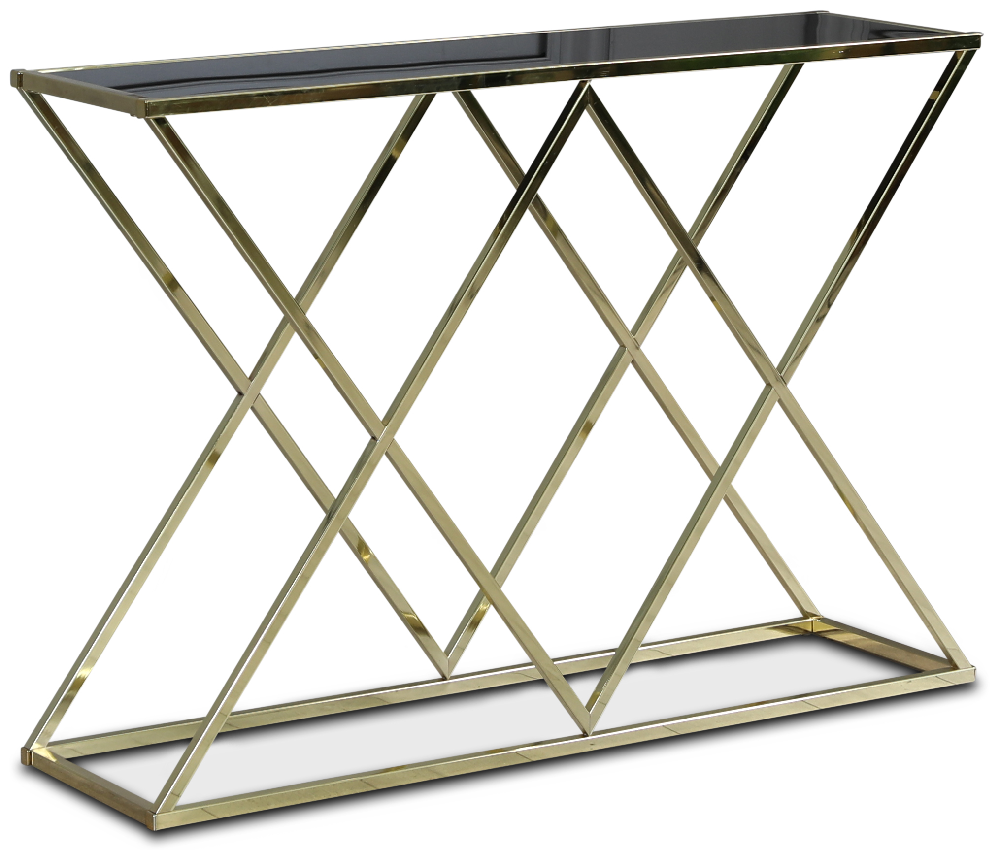 Stilrent konsollbord i blank messing med topplate i mørktonet glass.