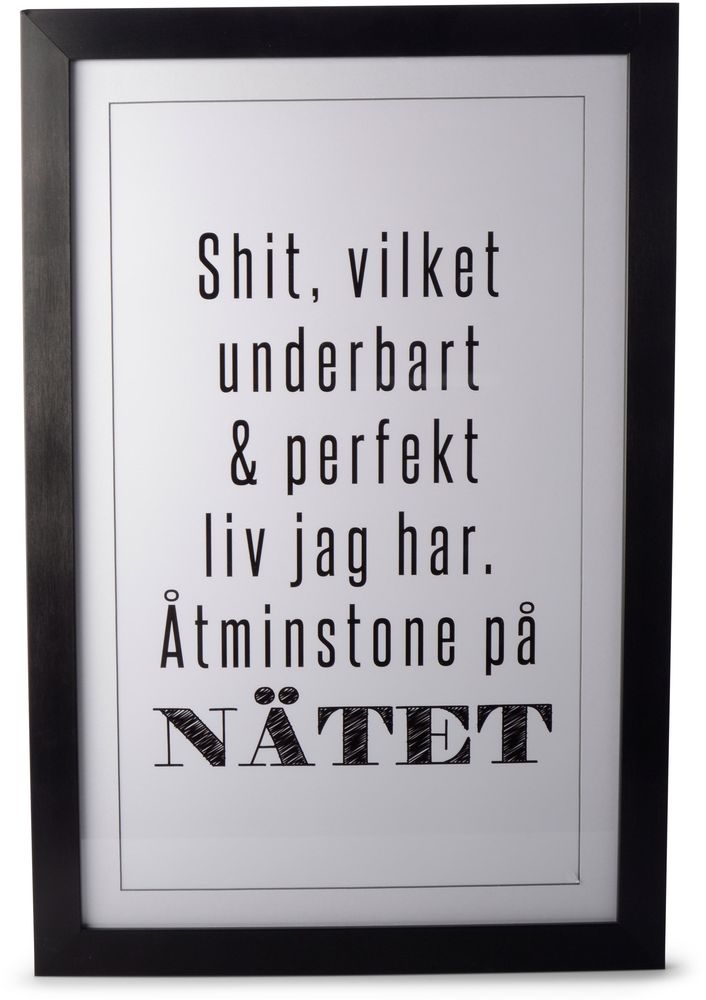En stilren og humoristisk maleri med svart plastramme.