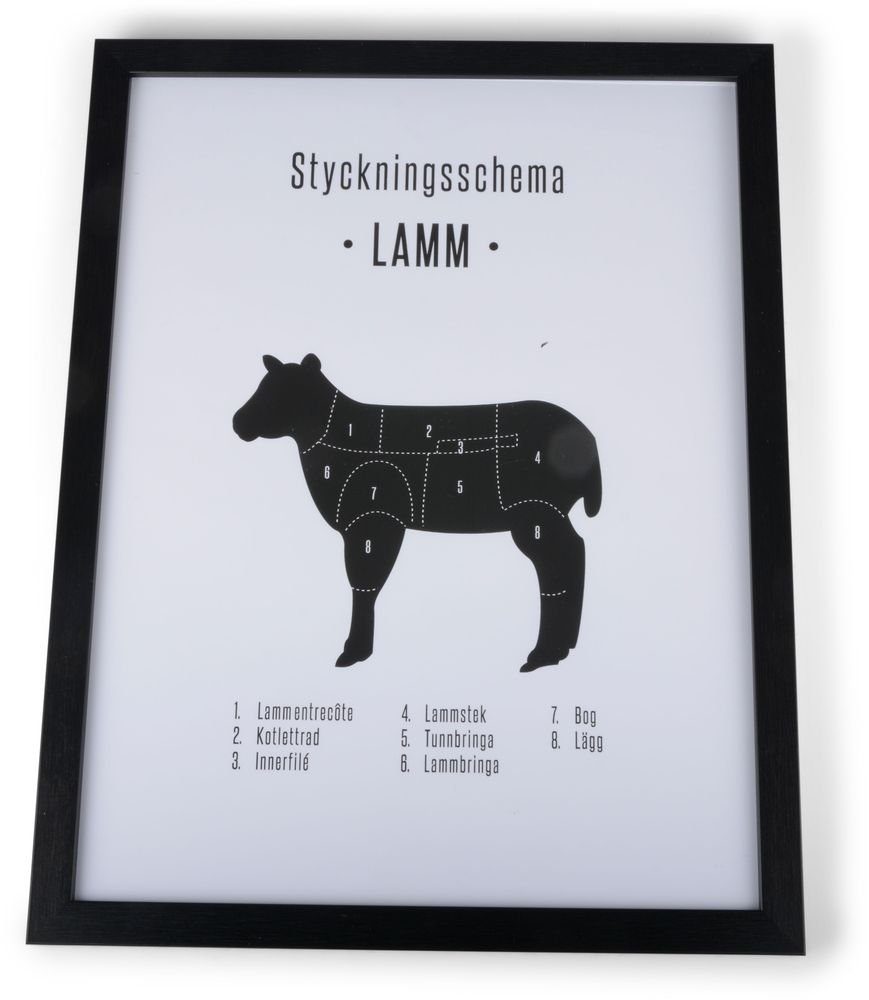 En pen og klassisk maleri med treramme og motiv av skjæreskjema for lam.