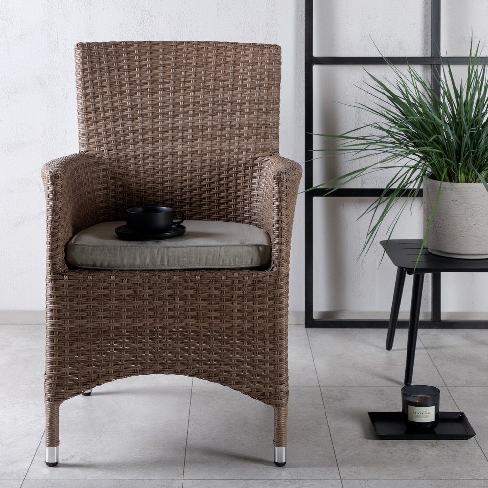 Moderne, stilig og slitesterk - hva mer kan du be om? I denne deilige lenestolen fra Malin-serien kan du nyte mange middager sammen med dine kjære i løpet av sommeren. Med en ramme i jordbeige aluminium og syntetisk rotting får du en robust stol som tåler tidens tann. Sitt komfortabelt i sommer og nyt deilige måltider utendørs! Stolen kan stables. Pleieråd: Kunstig halm er et plastmateriale som passer perfekt til vårt skandinaviske klima. Materialet er UV-bestandig og værbestandig. At det er UV-bestandig gjør at møblene ikke falmer, men vi anbefaler alltid å oppbevare møblene under et møbeltrekk eller på annen måte tørt og kjølig - for å forlenge levetiden.