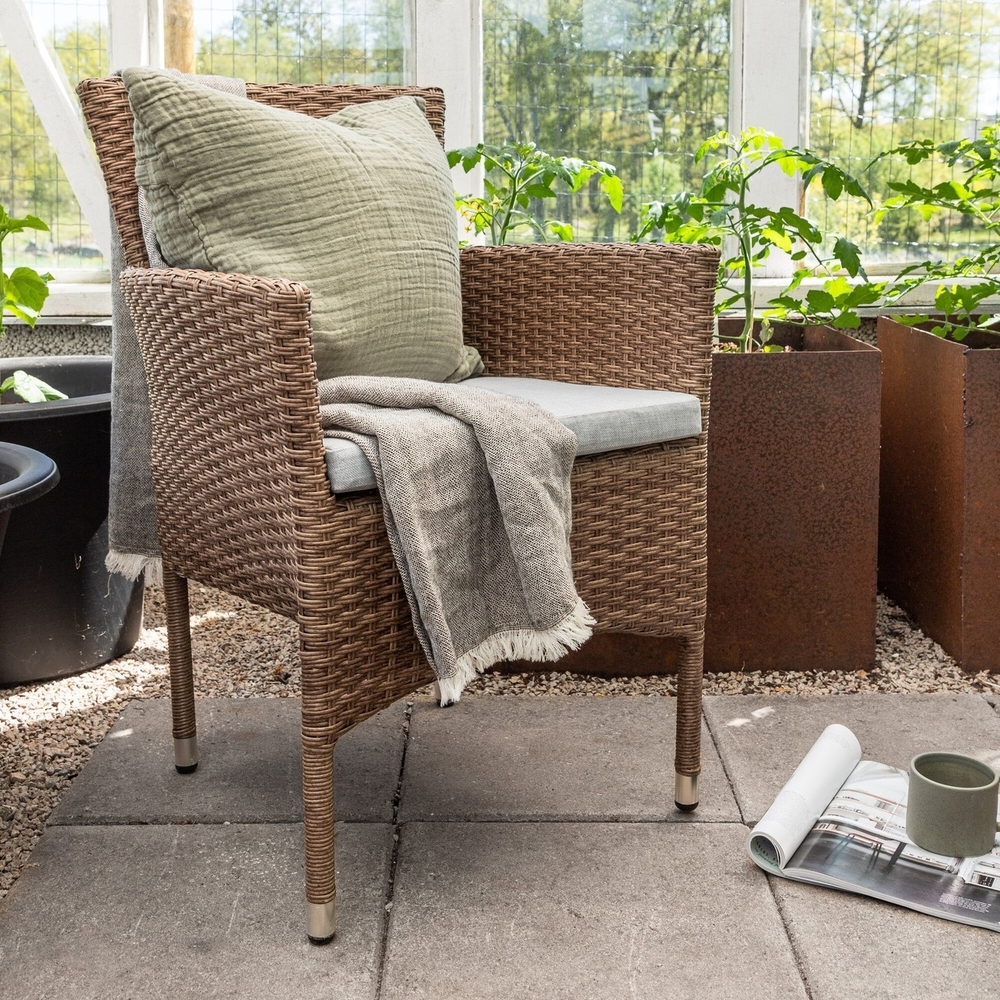 Moderne, stilig og slitesterk - hva mer kan du be om? I denne deilige lenestolen fra Malina-serien kan du nyte mange middager med dine kjære i løpet av sommeren. Med en ramme i jordbeige aluminium og syntetisk rotting får du en robust stol som tåler tidens tann. Sitt komfortabelt i sommer og nyt deilige måltider utendørs! Stolen kan stables.