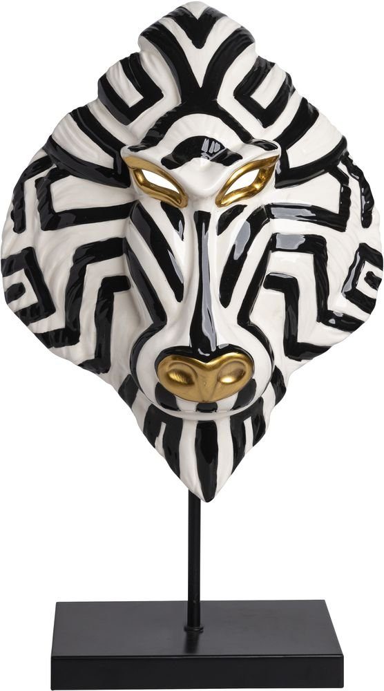 Maske av glasert keramikk med relieffmønster med detaljer i gull og svart. Masken kan også henges på veggen.