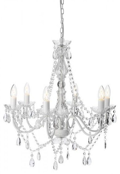 Klassisk hvit takkrone modell Maria Theresia! 6 lyskilder som gir et herlig skinn! Rammen er produsert i hvitlakkert metall med prismer i akrylog glassdetaljer!