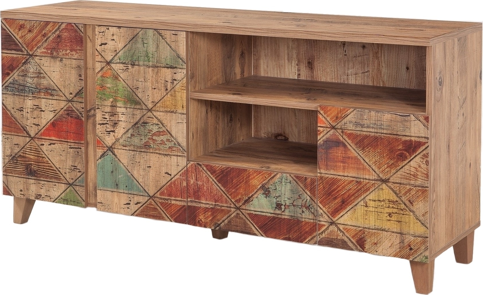 Mediabenk laget av melaminbelagt sponplate.