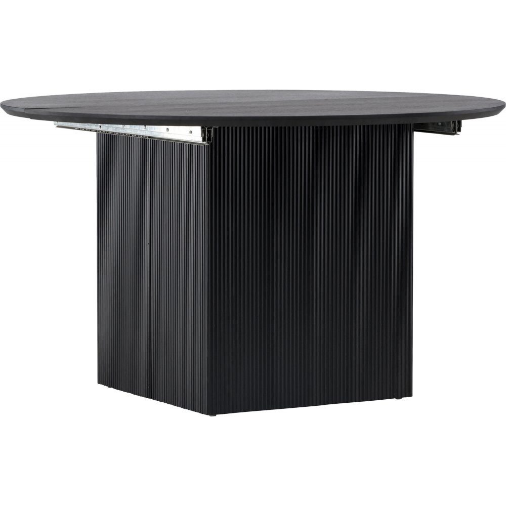 Dette stilige og smarte spisebordet kan tilpasses etter dine behov! Dette uttrekkbare spisebordet har en rund plate i sort MDF med finér og har en solid ramme med to blokkformede ben. Bordet gjøres raskt om til et lengre, ovalt spisebord så fort du har flere gjester på besøk. Ikke kompromiss mellom praktiske funksjoner og stilig design. I tillegg havner ingen på kanten her. Leveres umontert.