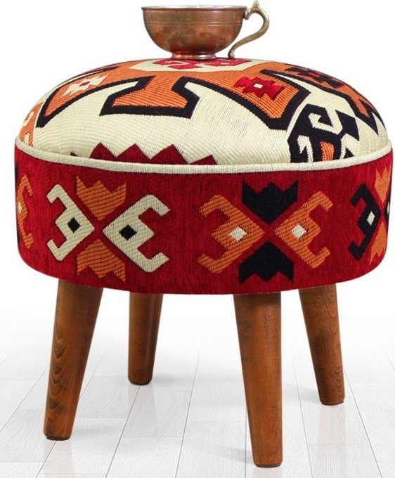 Puff laget av tre. Dekket med bomull og polyester. Stoppe skum.