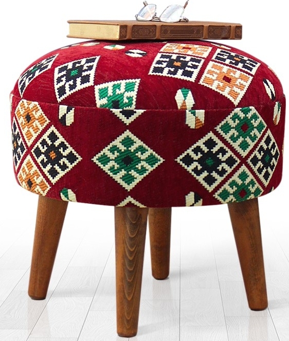 Puff laget av tre. Dekket med bomull og polyester. Stoppe skum.