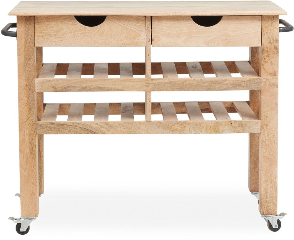 Praktiskt flyttbart bord på hjul, med skuffer og hyller. Laget av massivt mangotre.