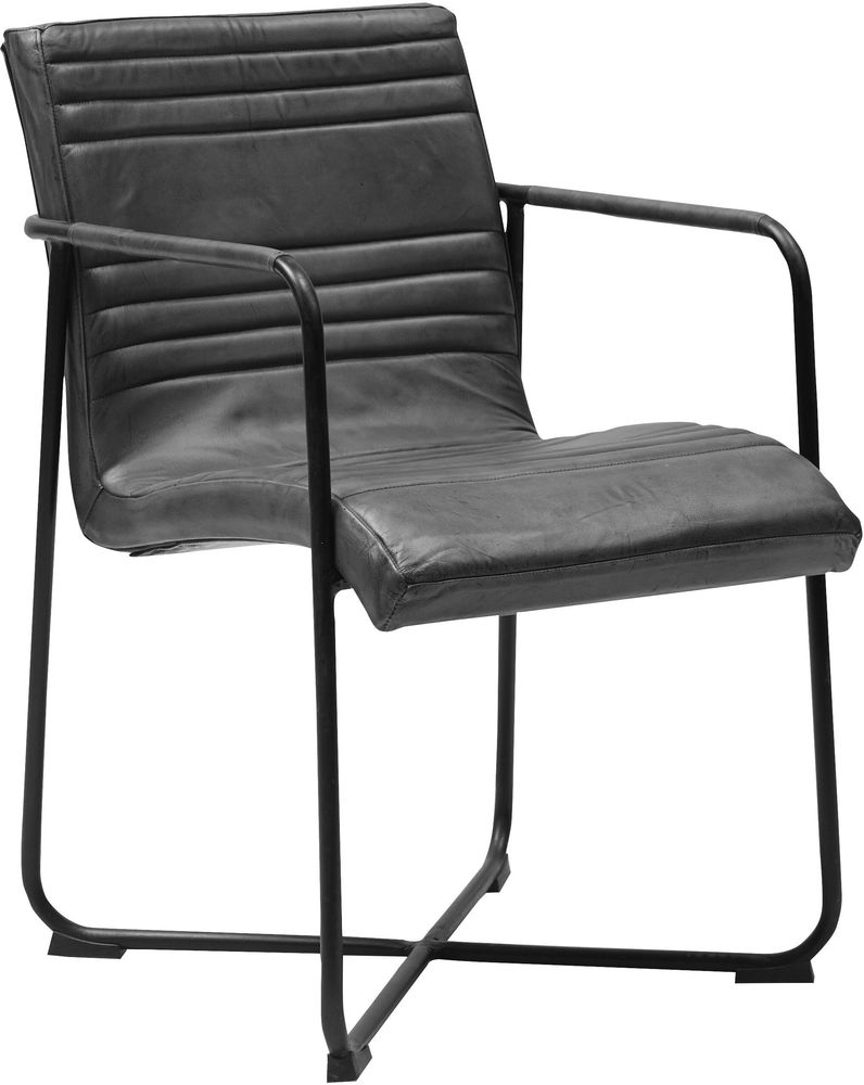 Karmstol i svart med stamme i metall. Sete av skinn.