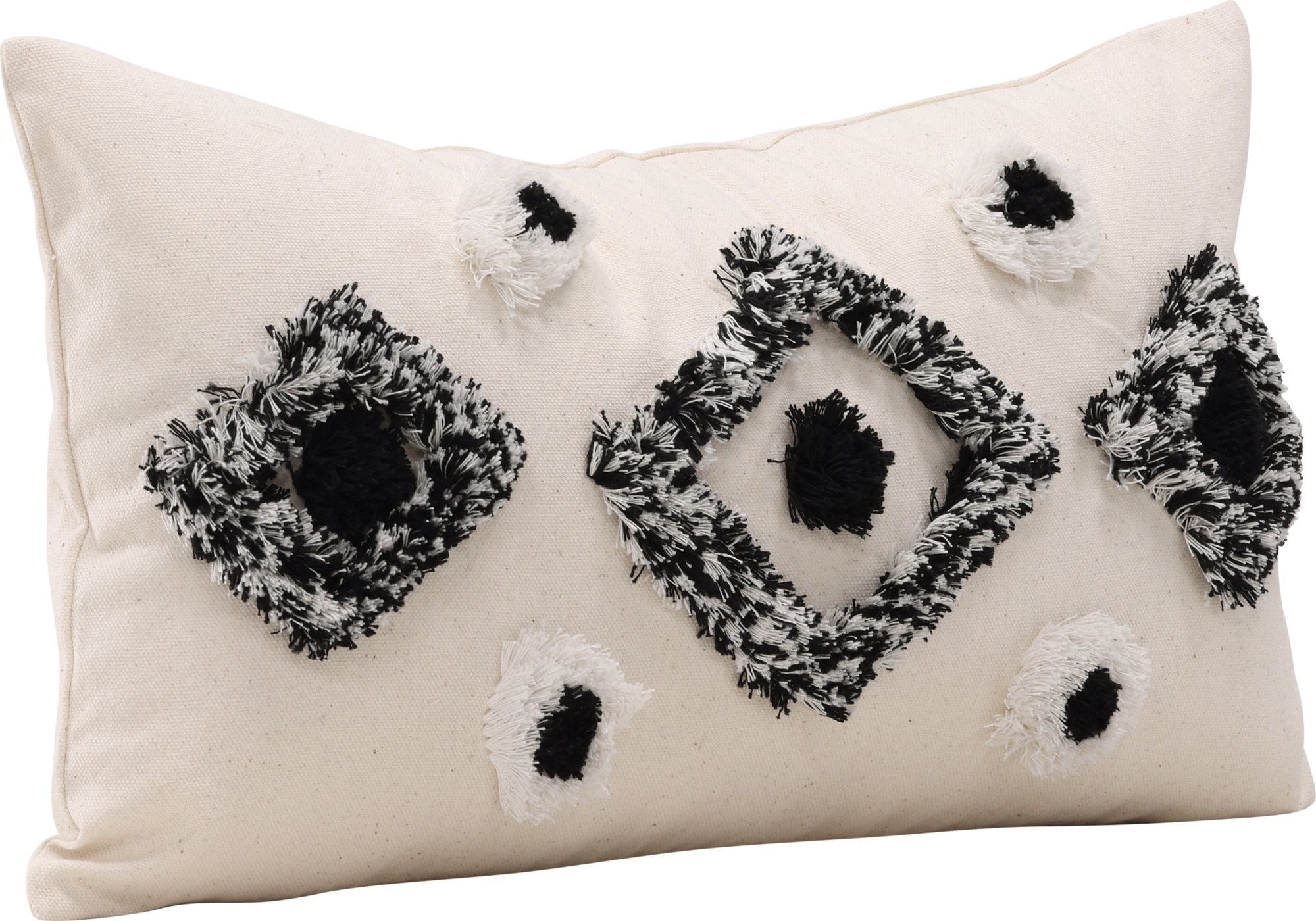 Putetrekk som kombinerer komfort med moderne design. Dette avlange putetrekket har en hvit fargebunn og et abstrakt mønster i tuftet materiale i både hvitt og svart. Laget i en perfekt polyester- og bomullsblanding som er både fleksibel og slitesterk. Skap et stilig blikkfang i sofagruppen med en trendy pute som enkelt kan matches og kombineres med andre putetrekk.