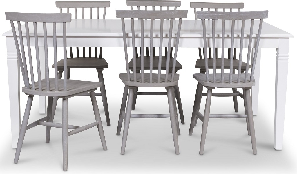 Mellby spisegruppe 180 cm bord hvit + 6 grå utkragende stoler