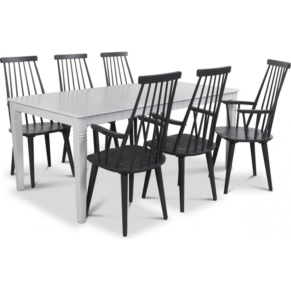 Spisegruppe Mellby fra Skånska Möbelhuset, Klassisk 180 cm spisebord i hvitlakkert tre. Seks klassiske grå Dalsland utkragende stoler med armlener!