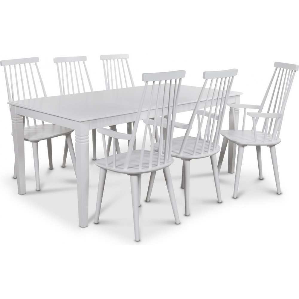 Mellby spisegruppe 180 cm bord med 6 stk hvite Dalsland Cane stoler med armlener
