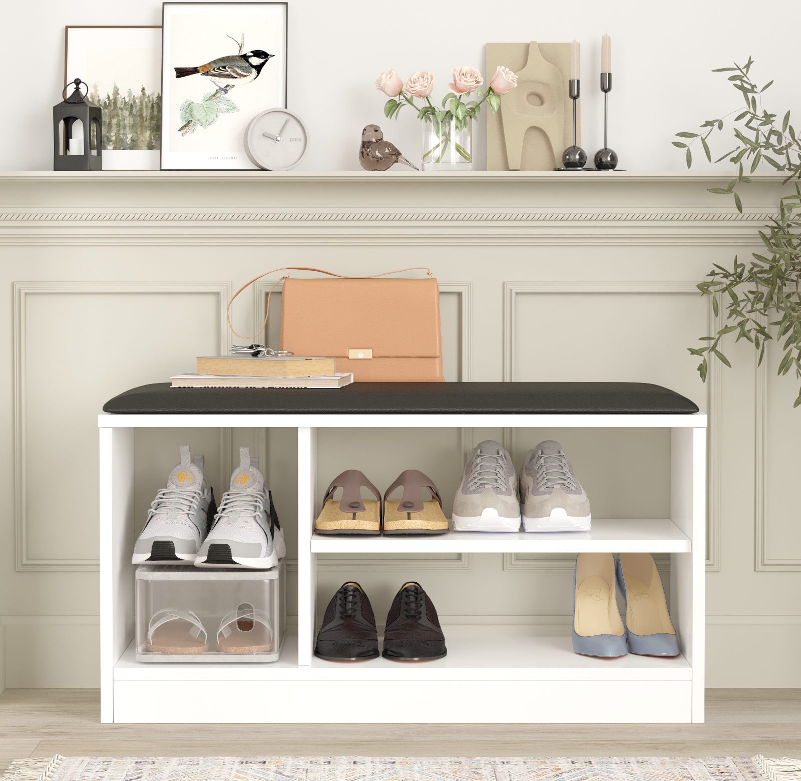 Skoskap laget av melaminbelagt sponplate. Dekket med PU-skinn.