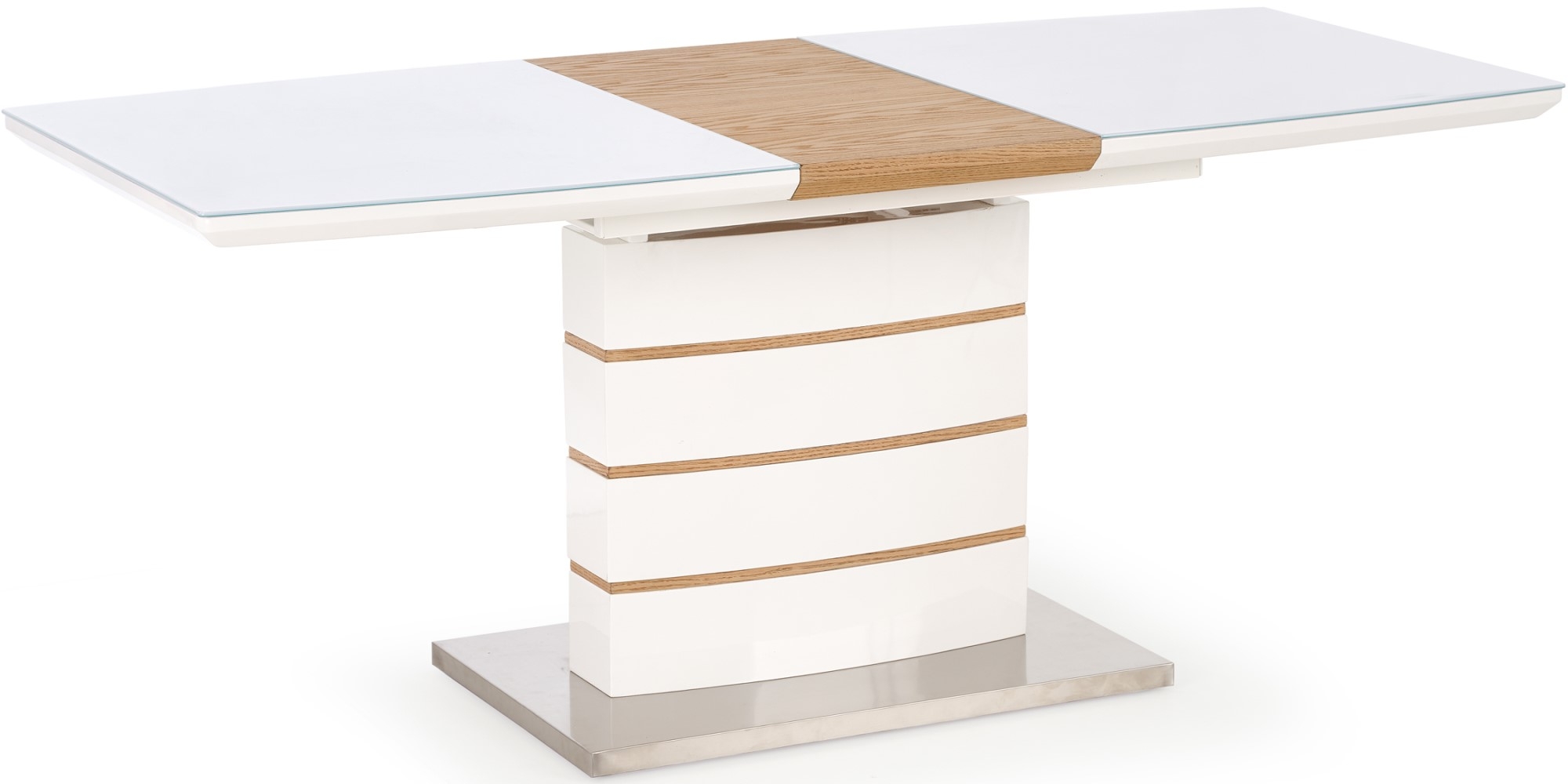 Et fint spisebord med et moderne design. Bordplaten er laget av lakkert MFP (premium treplate) med en overplate i klarglass og underdelen er av MFP (premium treplate) med fine detaljer i finér og rustfritt stål. Bordet er praktisk da bordplaten lett kan forlenges opptil 180 cm, tilleggsplate følger med.